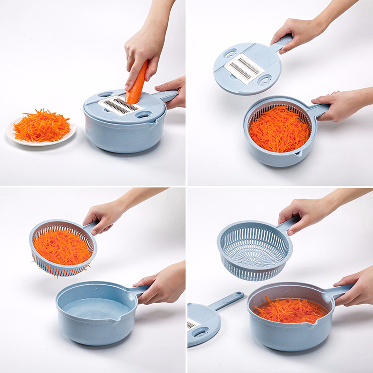 This is a uniquely designed vegetable cutter, integrating vegetable cutting and washing, which is very convenient, no need to find a container and pour it to complete the cleaning.