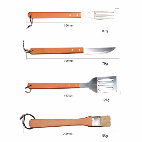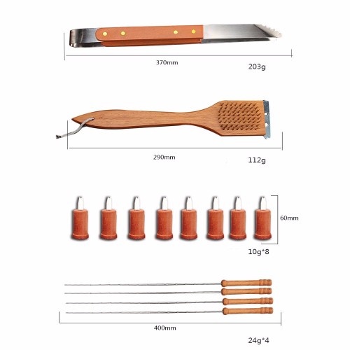 【18-piece barbecue tool set】 This barbecue tool set comes with all the tools you need to barbecue, including: 1 barbecue fork (360mm), 1 barbecue knife (360mm), 1 barbecue shovel (390mm), 1 pig hair brush (290mm) , 1 grilling clip (370mm), 1 wire brush (290mm), 8 Meat fork (60mm), 4 grilling pins (400mm).